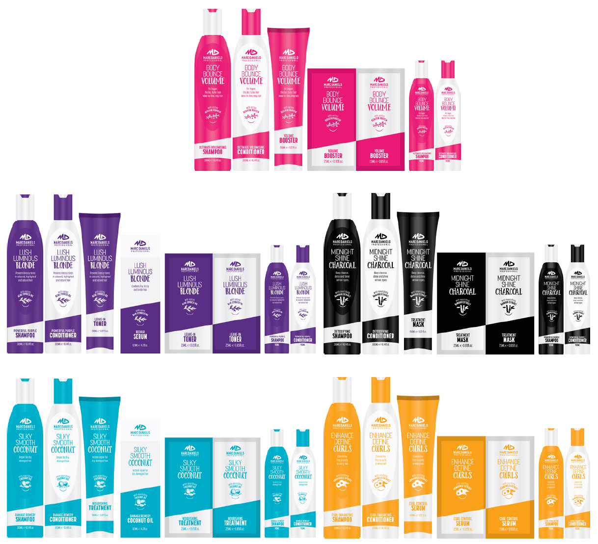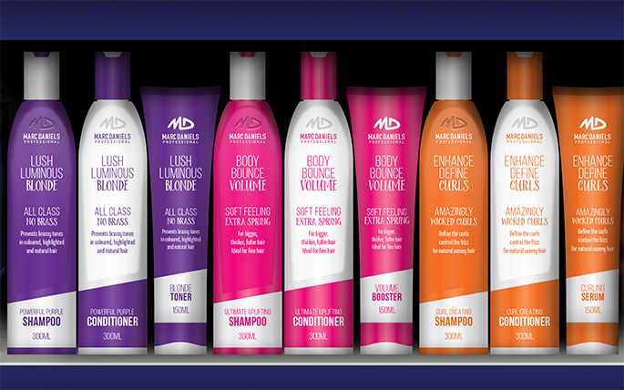Coo’ee was asked by Lenan Corporation to help them re-desing their range of successful Marc Daniels hair care products. We got to design the bottles themselves (and in some cases the boxes they come in) as well as the colours, fonts…the complete look of the range across some 35 products.
